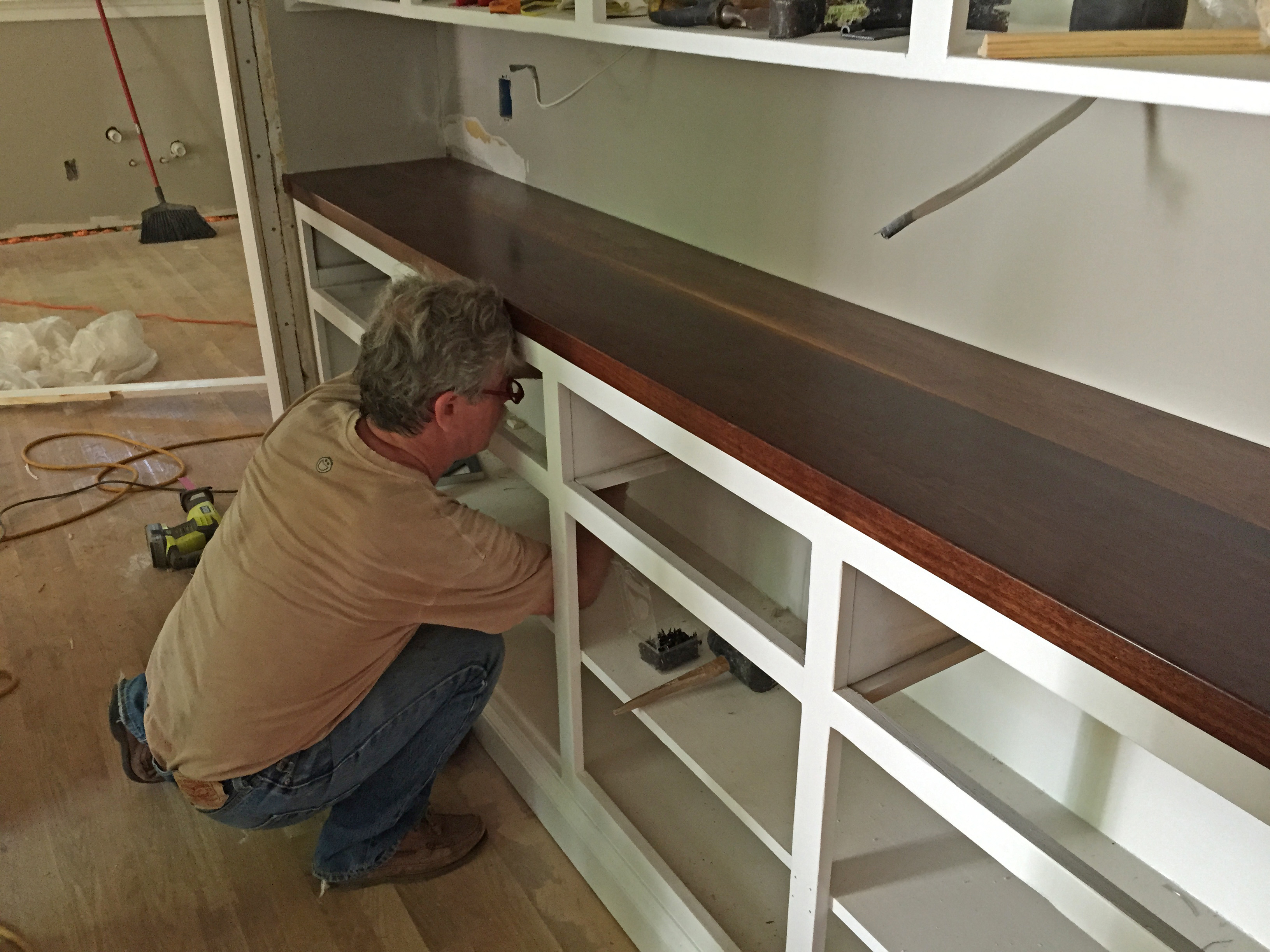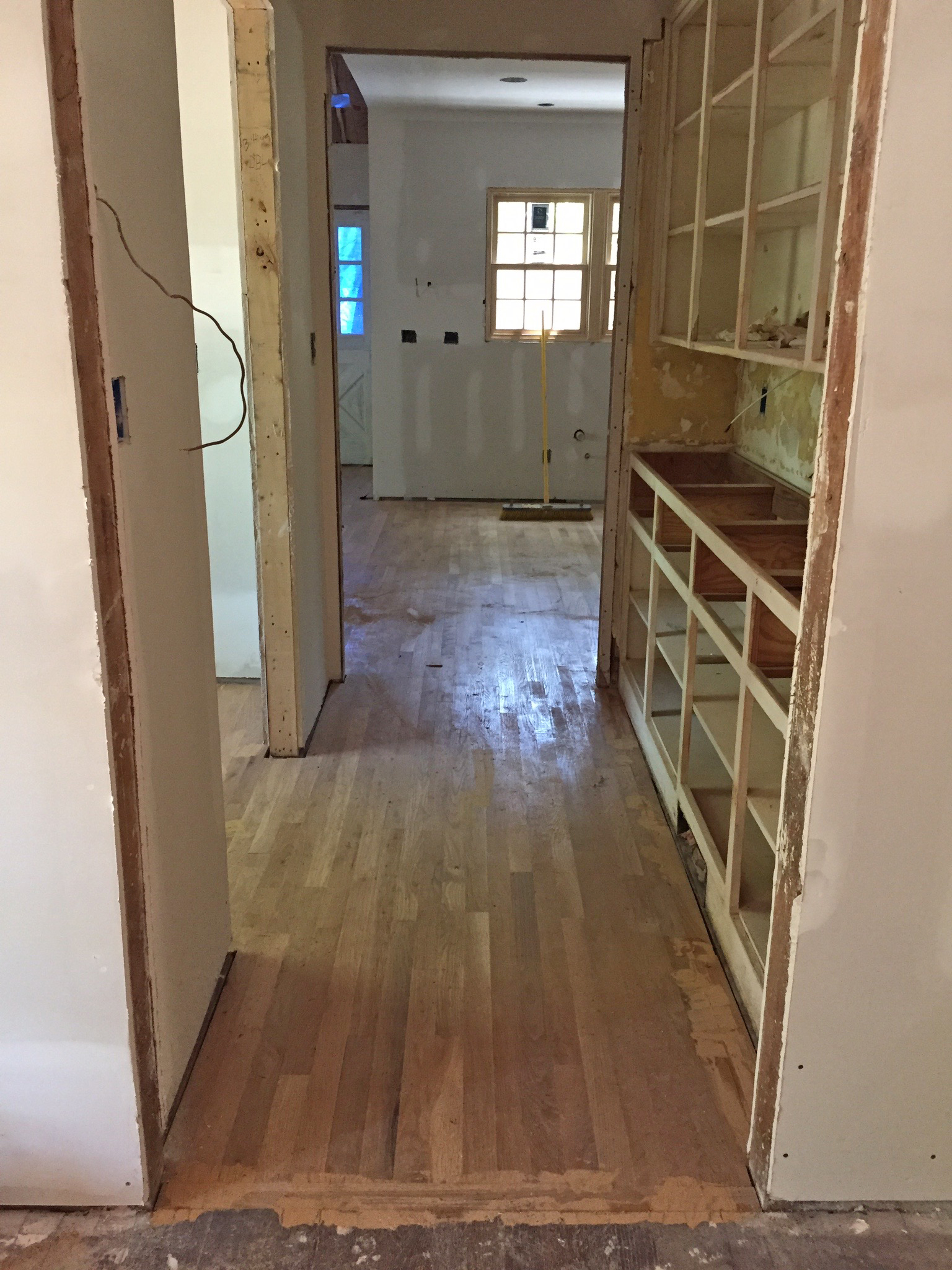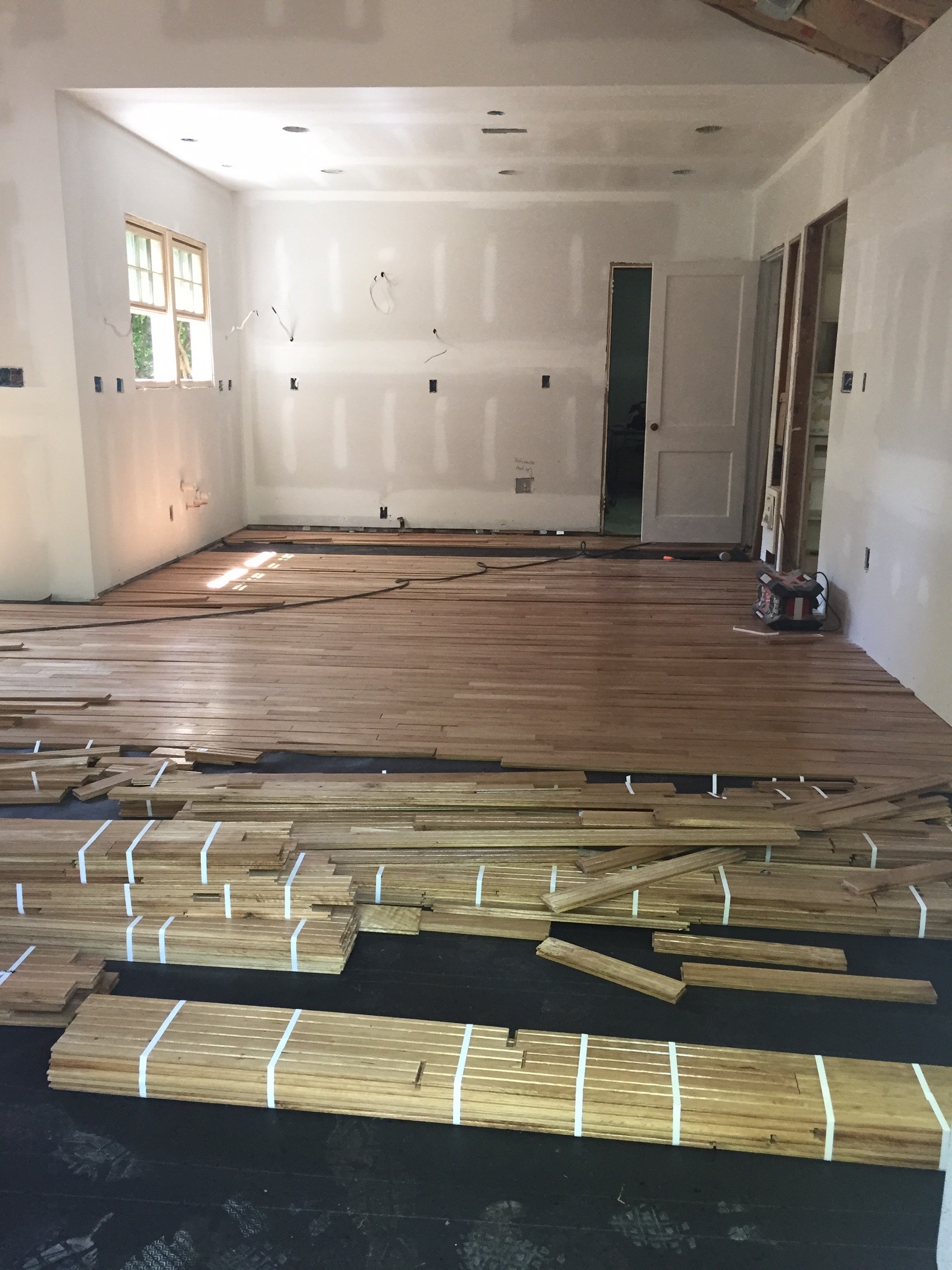 Butler’s pantry floors are installed. (The tan goopy stuff that looks like peanut butter is actually a filler the floor professionals use to fill gaps and help join the new wood to the old in the most seamless way. The filler takes the stain just like wood!