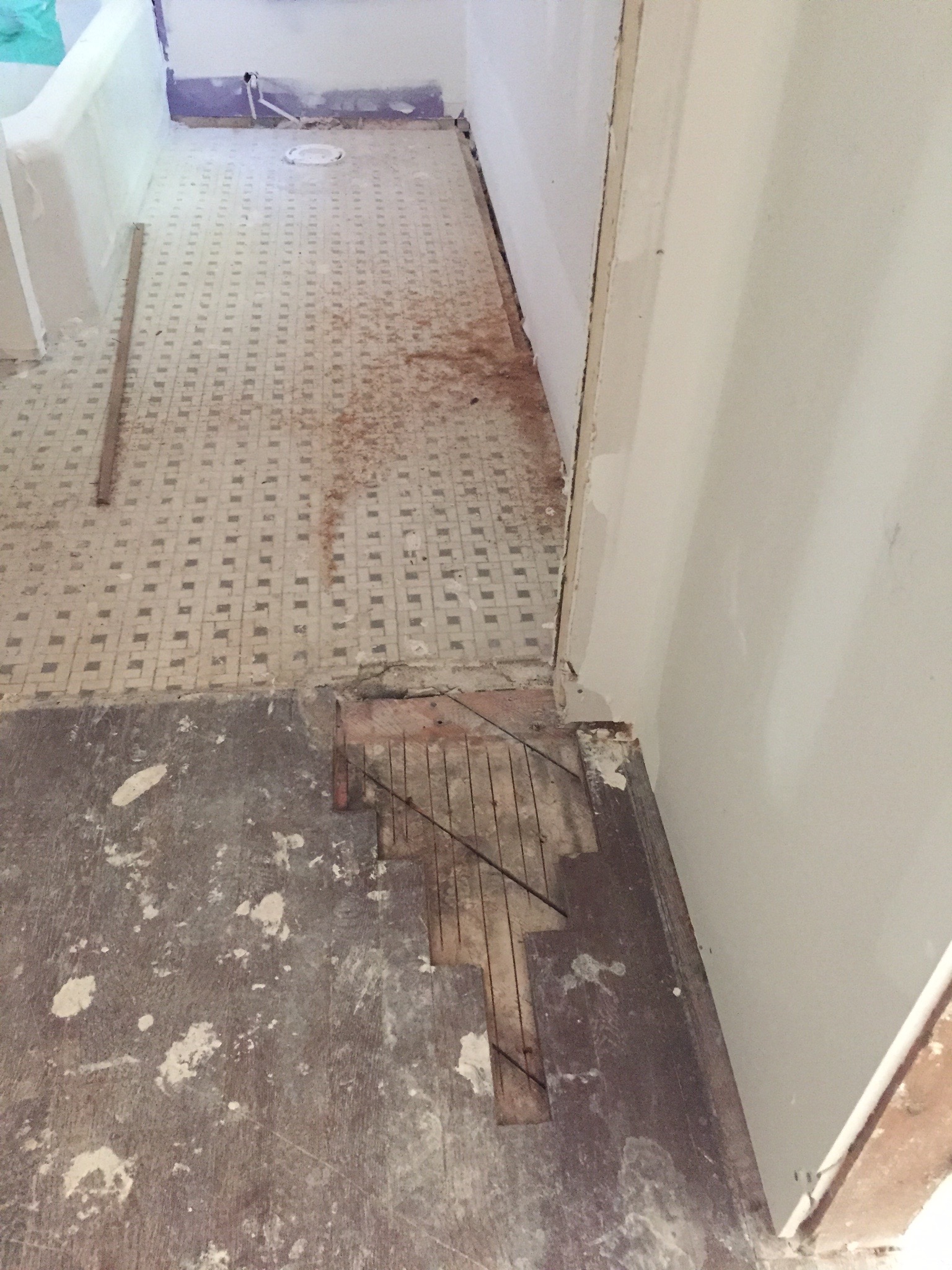 Hall bathroom patched! (We moved the doorway about 18" to the right, leaving a gap in the hardwoods).