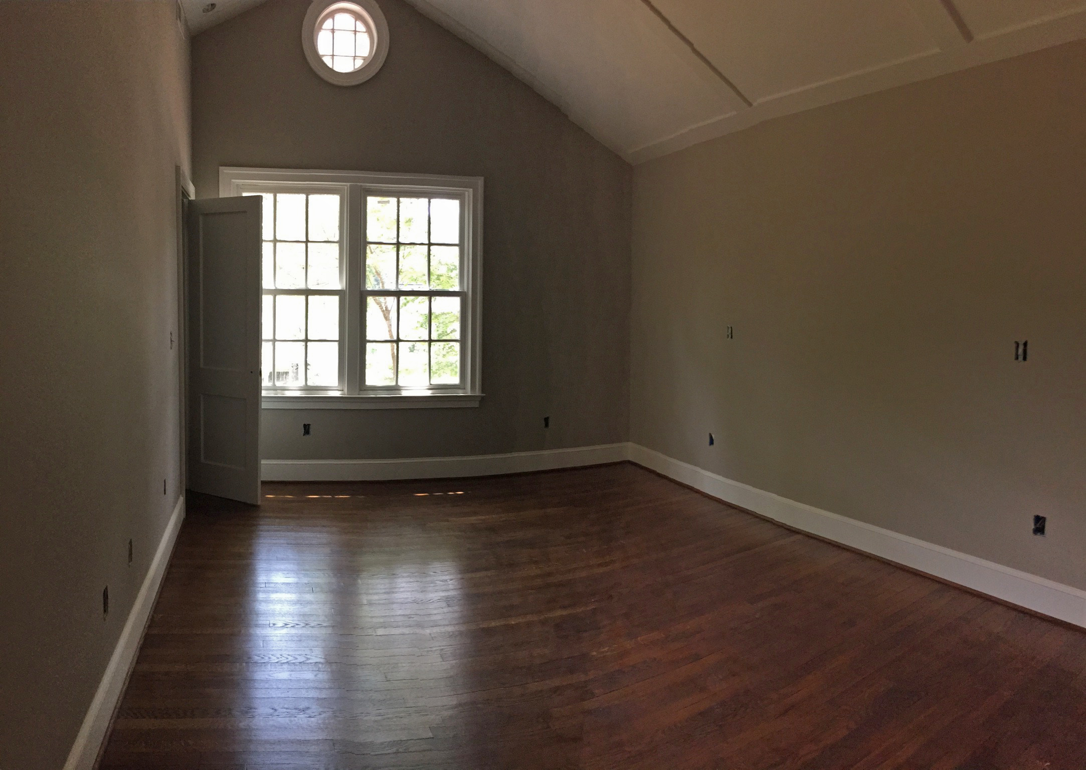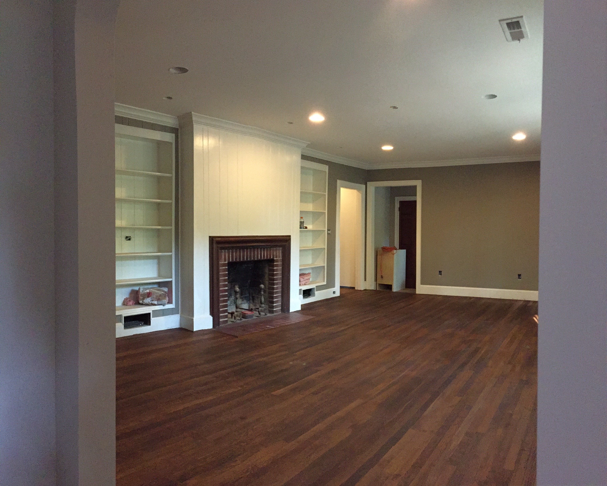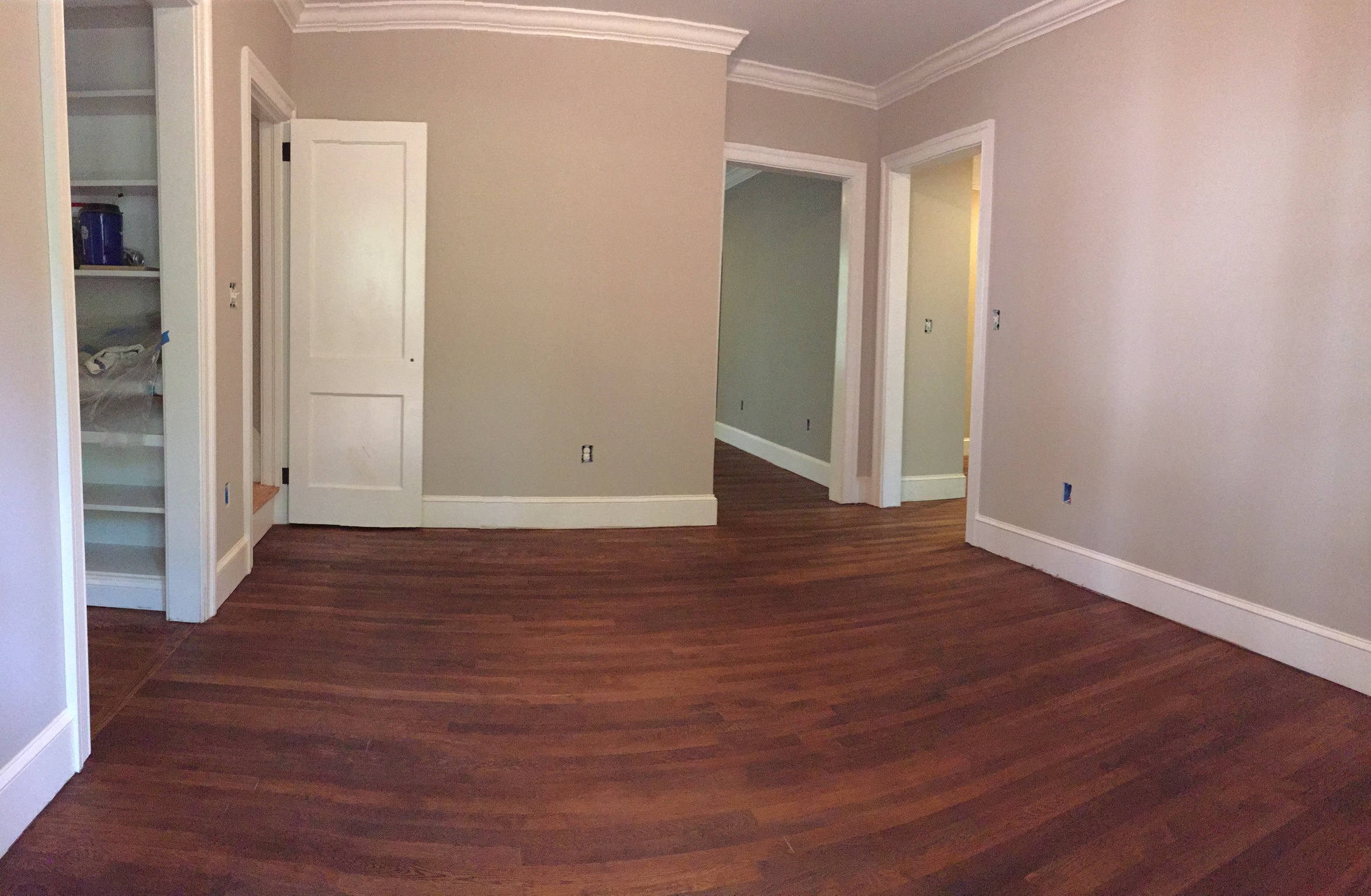 Upstairs, too! These floors are all heart pine and were treated with one coat of poly first, then stained with a mix of stain (red mahogany) and polyurethane to recreate the look of aged heart pine. We had to use this method because pine is notorious for staining very unevenly. So, essentially, we stained the first coat of poly instead of the raw wood. This gave it an even, naturally aged pine color.