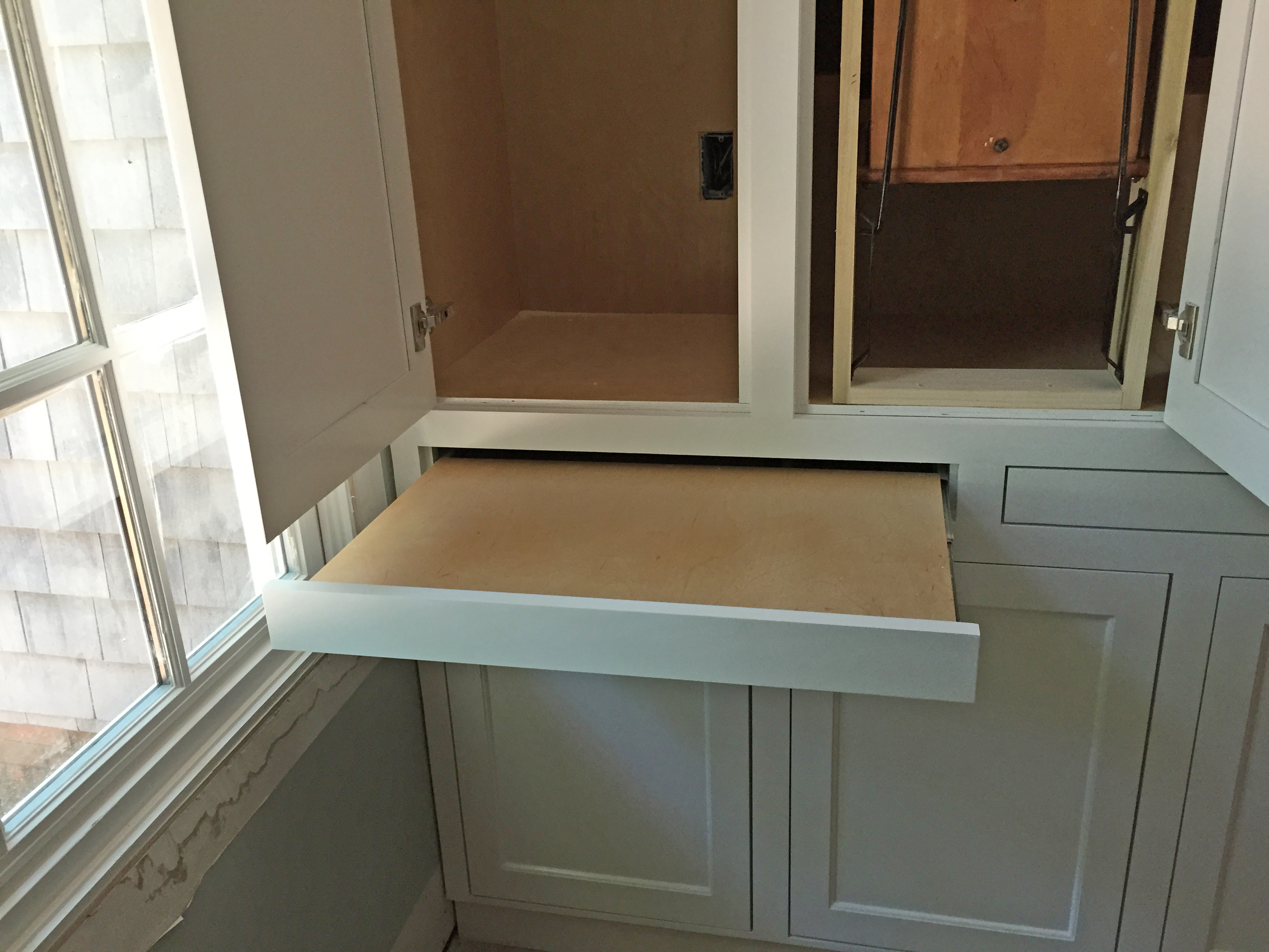 One of my favorite things we did in the kitchen was turning the old ironing board cabinet into a place to keep all our spices. The cabinet maker removed the old built-in ironing board (and relocated it into our laundry room cabinets) and added small shelves just the right size for spice jars. I had our cabinet maker restore the little "trap door" used to store the iron and keep that as part of the cabinet -- so cute!