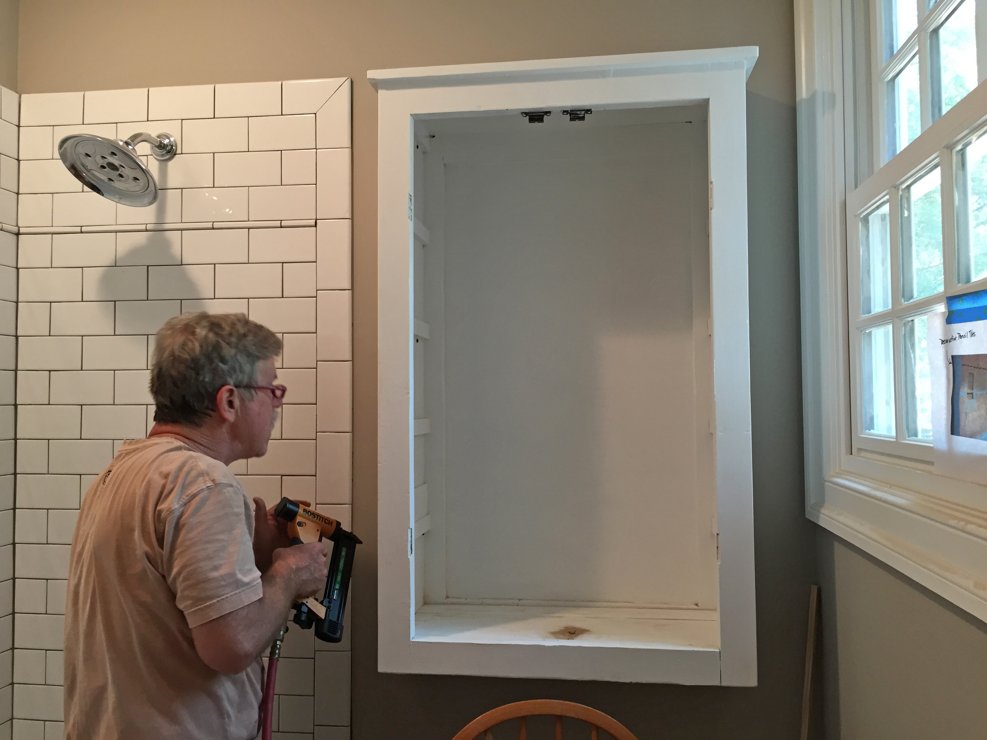 Next, the cabinet itself had to be modified. My dad helped us by cutting off the cabinet’s legs. A delicate job that almost came off without a hitch… until one of the glass panes broke. 😦 This turned out to be a blessing in disguise because we replaced the lower panes with bead board which now allows us to use the lower storage space for toiletries that are better kept out of sight. We also had to trim the trim. Yes, we had to cut down the trim at the top of the cabinet, but just the part that would interfere with recessing it into the wall. Make sense?