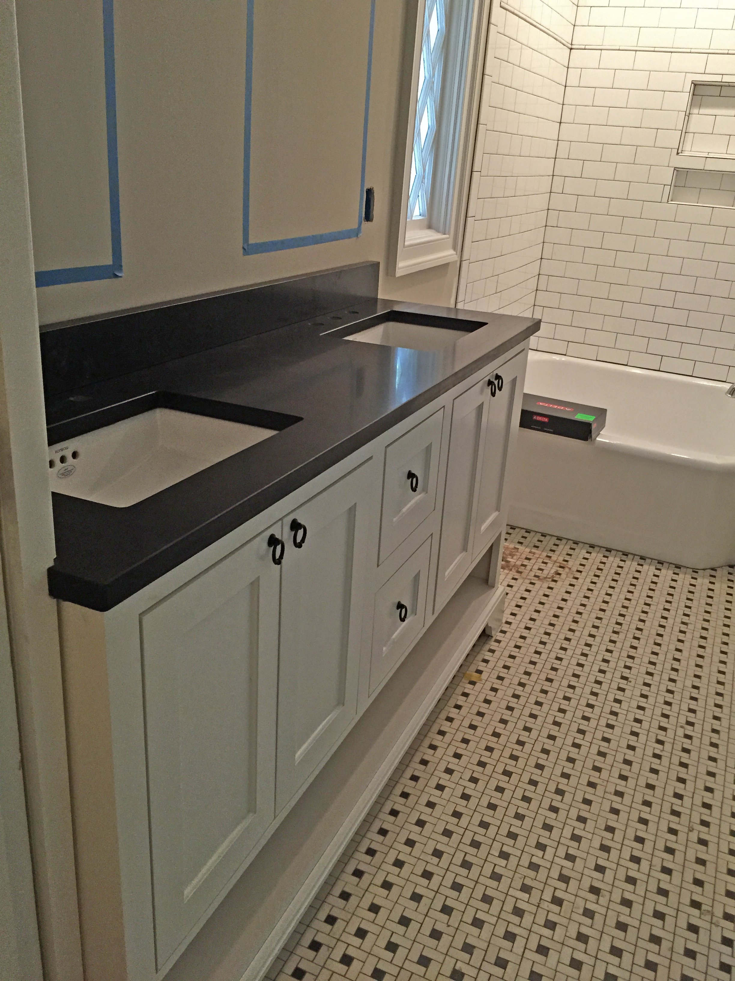 Making this little gem a reality was no easy task though (what else is new??).  Since my mom came across the cabinet back when we were still doing the framing, my dad was able to frame a hole in which the cabinet could be set. Acting like an oversized medicine cabinet, this idea would allow us to use the full depth of the cabinet without having it stick out into the room more than a few inches. Genius! Well, until we realized there was an old iron sewer vent pipe right where the cabinet would go… Luckily, our plumber had planned to shatter all the old sewer pipes and replace them with new ones as part of our plumbing scope. We just made sure to have him route the new pipe in a different location clearing the way for our special cabinet.