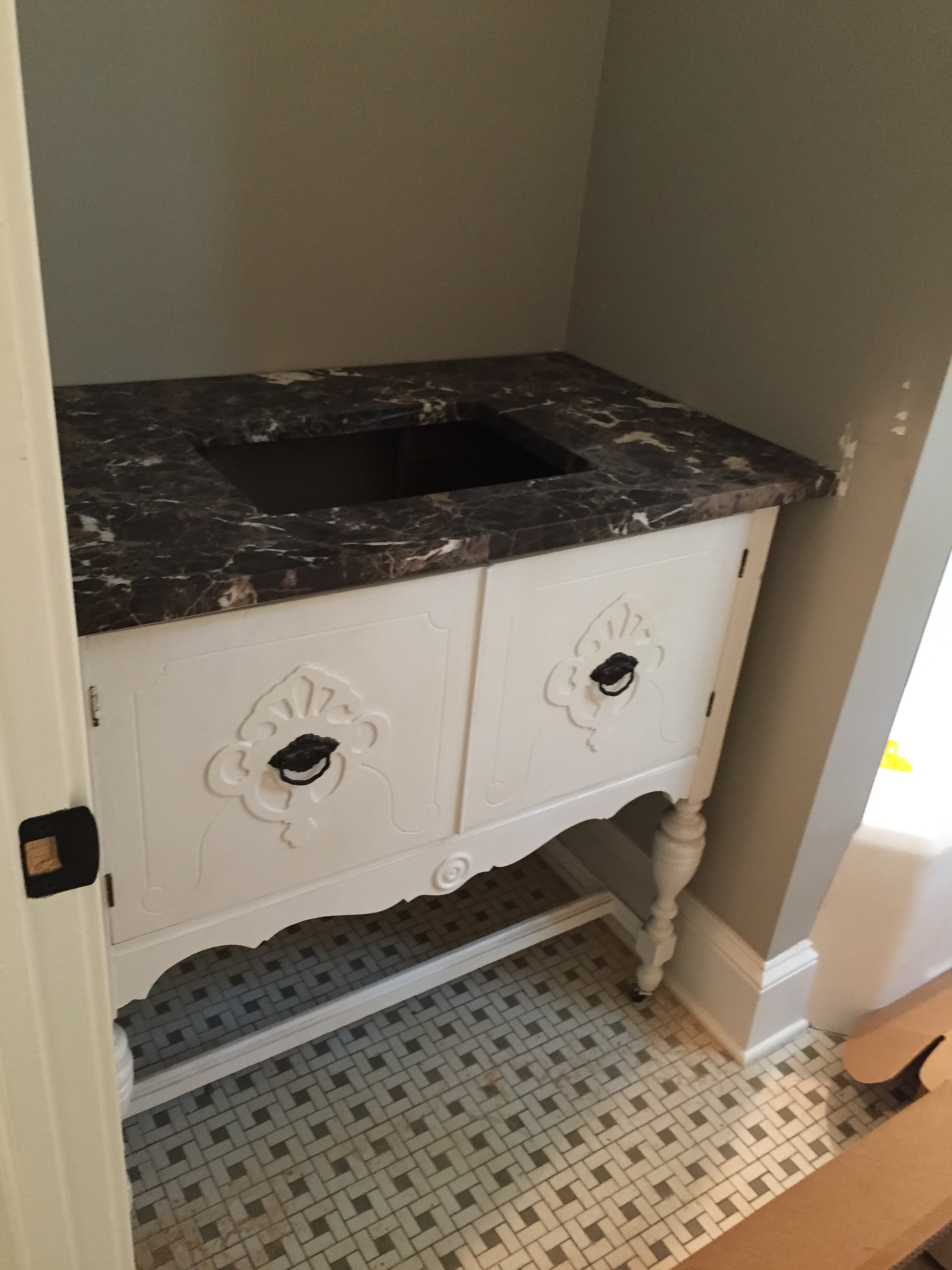 The hall bathroom vanity was just a pedestal sink before we began our renovation. We worked hard to create a more functional space there by moving the doorway and creating an “end cap” wall at the foot of the tub to close in the shower and form a definitive vanity space. This little nook is the perfect spot for a petite vanity, so Matthew and I searched for months for a piece of furniture we could repurpose in this space. After trips all over Greenville and nearby Asheville, and lots of Craigslist surfing, we found ourselves at a little salvage place in Powdersville, SC and stumbled upon a small server that was just the thing! Cute, isn’t she?