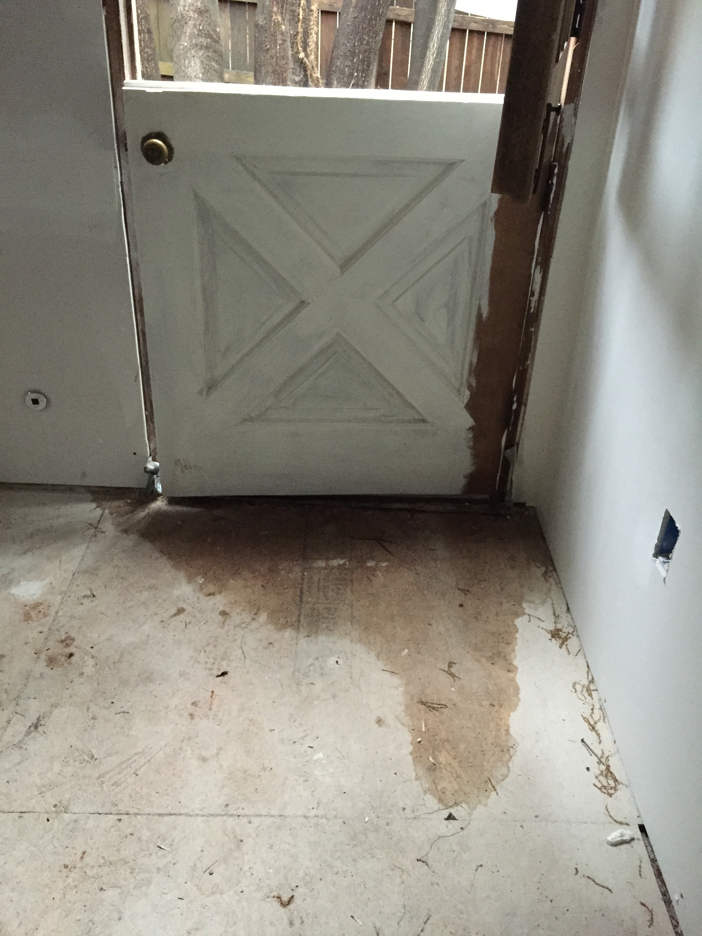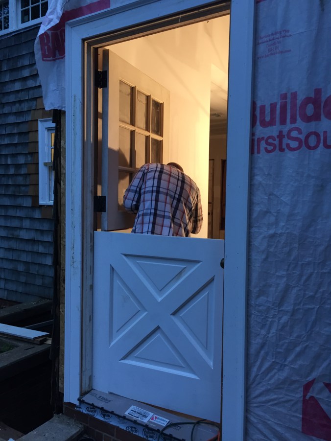 Besides the overall sanding, stripping and repainting, this sweet little Dutch beauty had to be weather-stripped and water-tested (there’s no overhang above the door, so we had to be sure it was watertight). We set to work adding weather-stripping to the doorframe, but didn’t realize we would also need to seal all the window panes and the split between the top and bottom halves of the door…until we tried the “hose test.” Despite our best weather-stripping efforts, she leaked like a sieve.