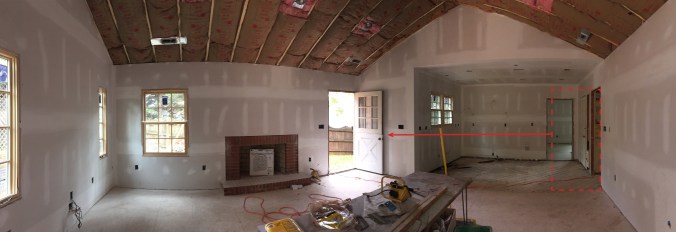 Hall bathroom patched! (We moved the doorway about 18″ to the right, leaving a gap in the hardwoods).