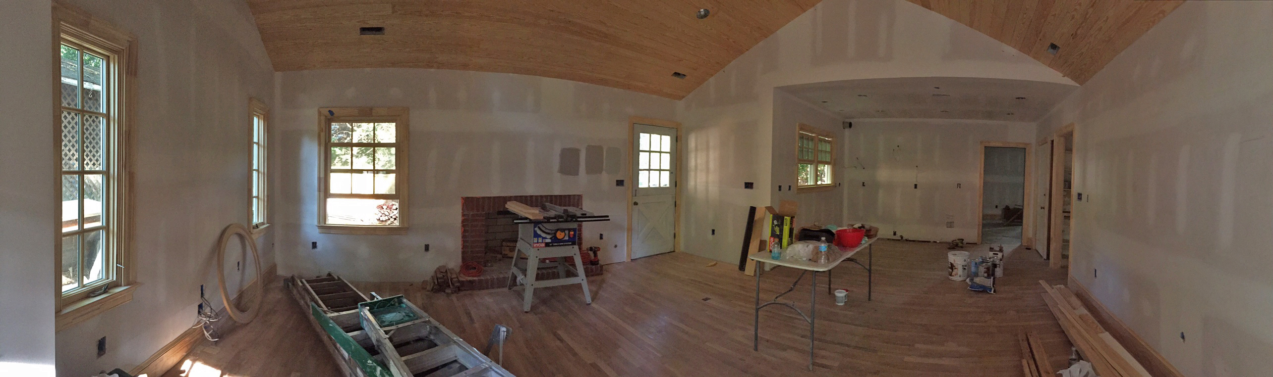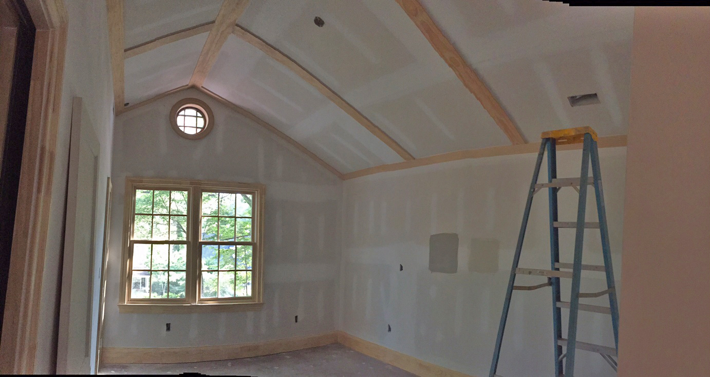 For two weeks now, the trim carpenters have been busy little birdies trimming our nest and making it look its very best. They’ve been more than patient, too. As with any old house, things aren’t exactly plumb and square around here… so the carpenters had to take a few deep breaths and get creative on projects like re-hanging old doors, dealing with a few slightly sloping floors and installing a tongue and groove ceiling in a room that is slightly off from square (They were within a few boards of being done when this little snag became apparent and had to rip it all off and start again with a slight adjustment to compensate. Yikes!).