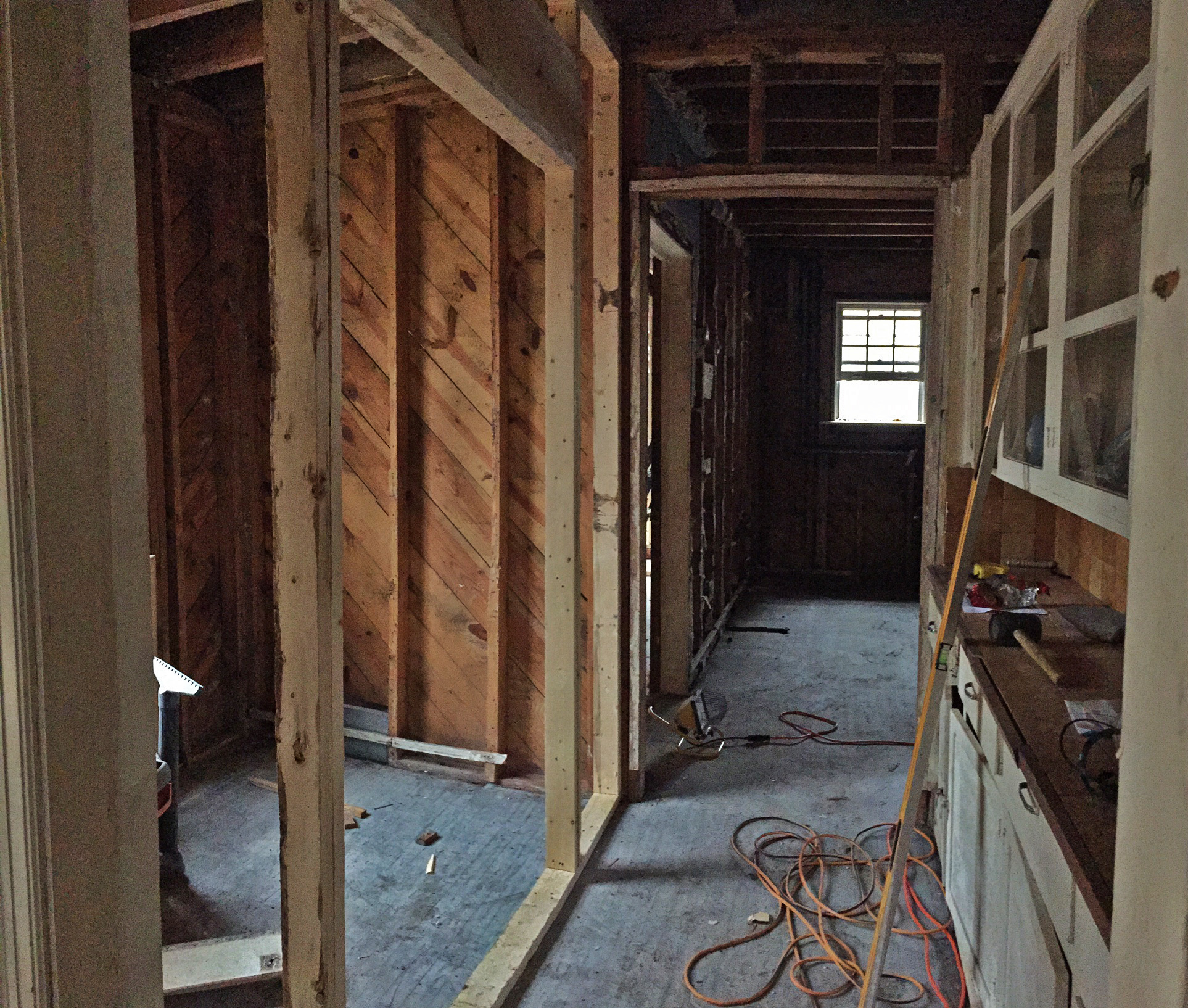 Naturally, he had an ever better idea! Our joists were certainly thick and sturdy enough to do the job, but they were made of pine. As mentioned in the floor refinishing post, pine does not stain well and our “vision” was of a darker, richer wood counter top, not raw pine. It just so happened that my father (the forester, master craftsman, AND wood hoarder 🙂 ) had a stash of beautiful walnut left over from when my parents built their kitchen island. Glory! It was just the thing. We are so fortunate that the Harpers were willing to part with such special materials and my dad created a handmade walnut counter top for our butler’s pantry by joining two large pieces together and lovingly applying coat after coat of tongue oil and polyurethane.